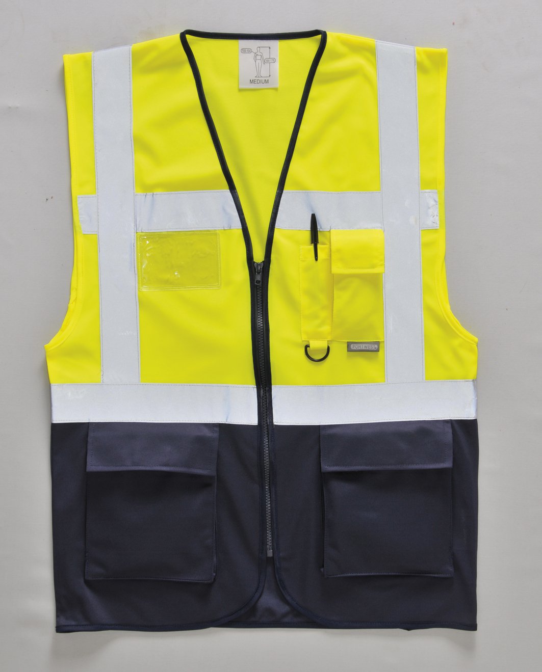 Güvenlik geçişleri ve kartları için açık kimlik cebi.İlave cepler.Çift renk kombinasyonu.Sarı-lacivert renk.5cm reflektif şeritler.CEEN 471